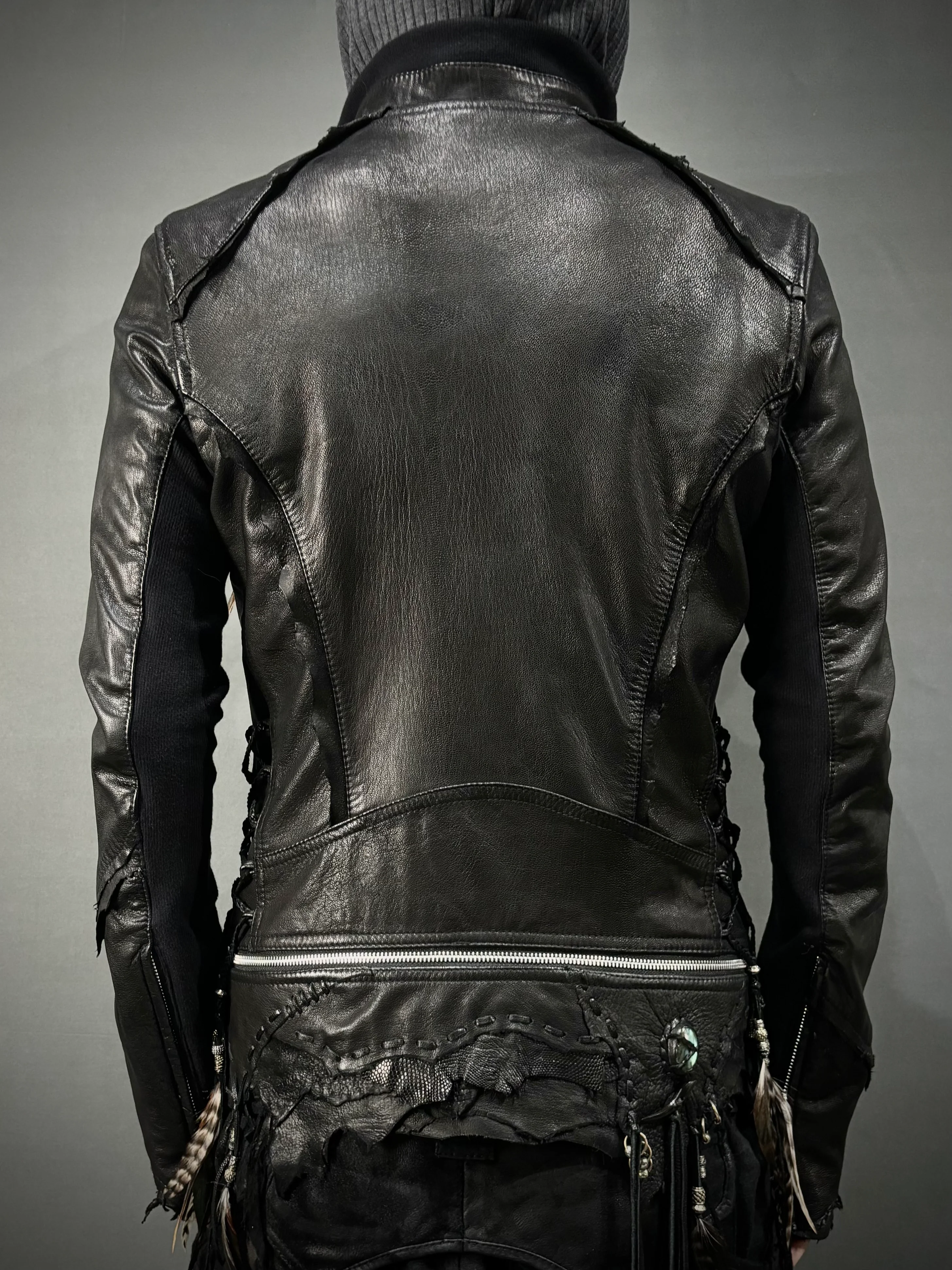 This 'BEAT IT 24' design is a revival of the 2009 model, featuring raw-edged sleeves adorned with lizard skin and wild bird feathers, old Mexican coins embellished with garnets, and labradorite stones. All beads and charms are original to 14th Addiction. This updated version represents the evolution of the 2009 model into 2024. We created this design with inspiration from the deserts of Mexico.