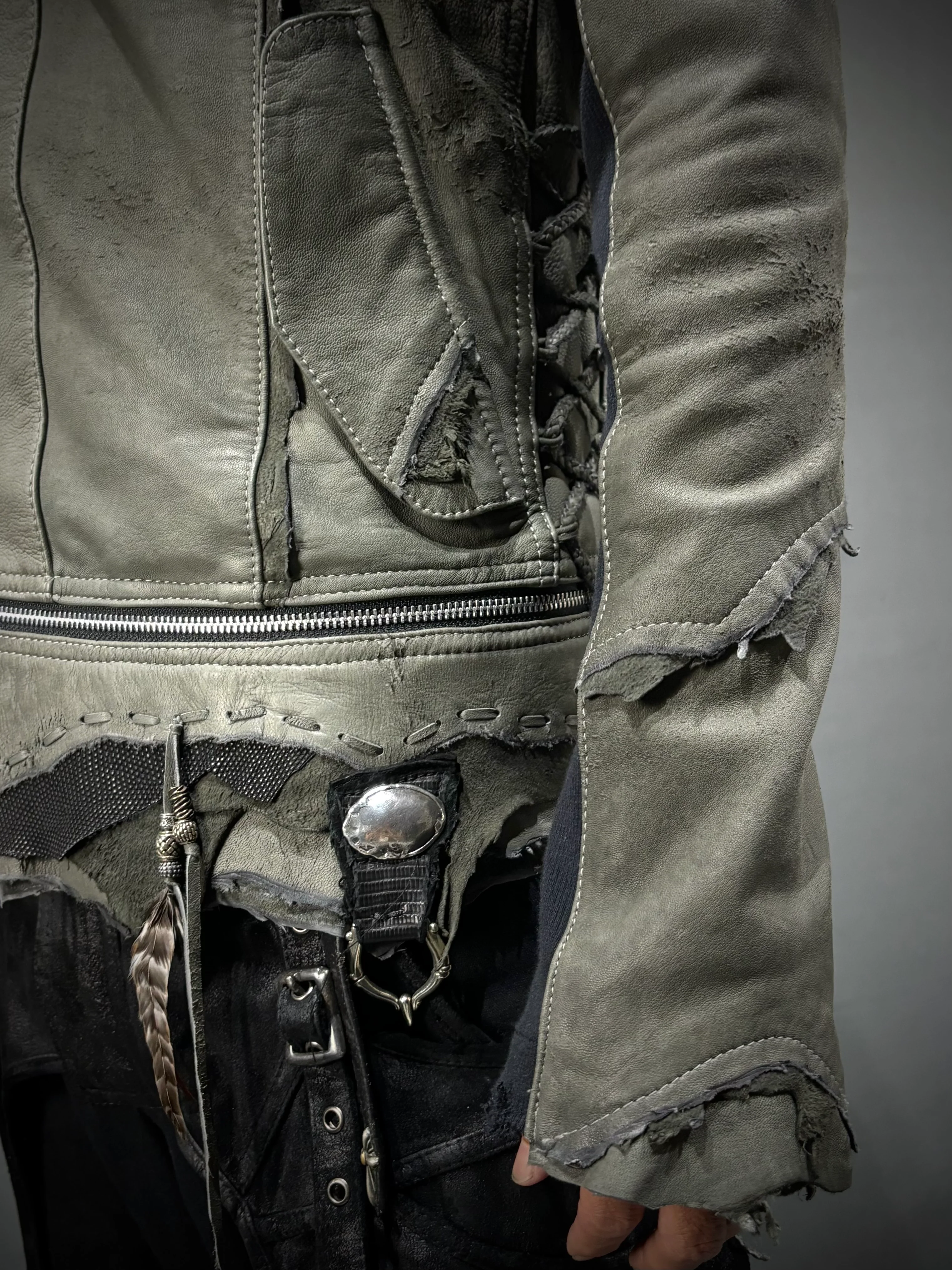 This 'BEAT IT 24' design is a revival of the 2009 model, featuring raw-edged sleeves adorned with lizard skin and wild bird feathers, old Mexican coins embellished with garnets, and labradorite stones. All beads and charms are original to 14th Addiction. This updated version represents the evolution of the 2009 model into 2024. We created this design with inspiration from the deserts of Mexico.
