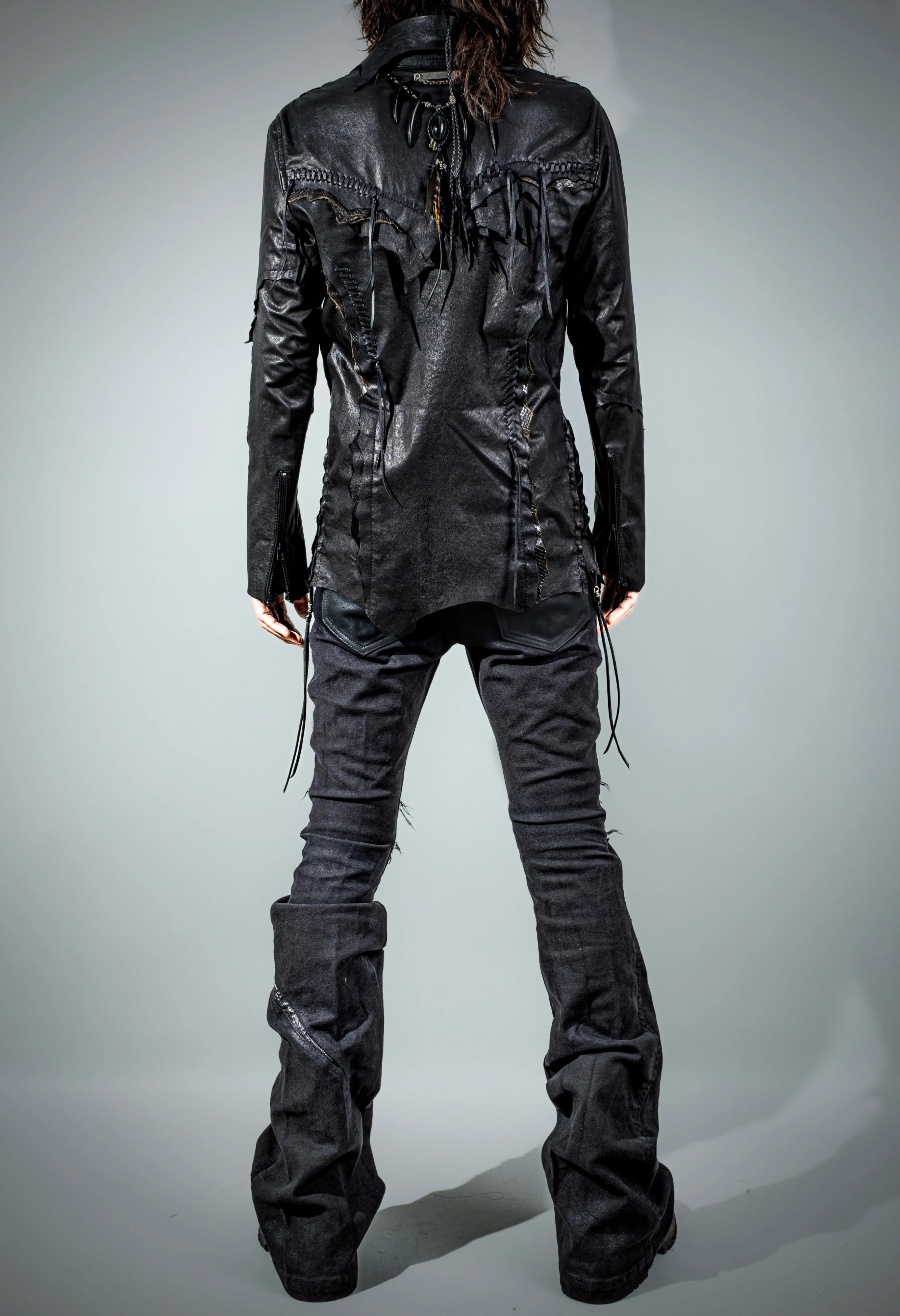 A striking presence in the Desperado lineage, this jacket carries its power in symbols. From the back collar drapes a necklace-like design—part ornament, part invocation. A guardian emblem. A prayer in motion. It holds the tension between feral wilderness and inner stillness.