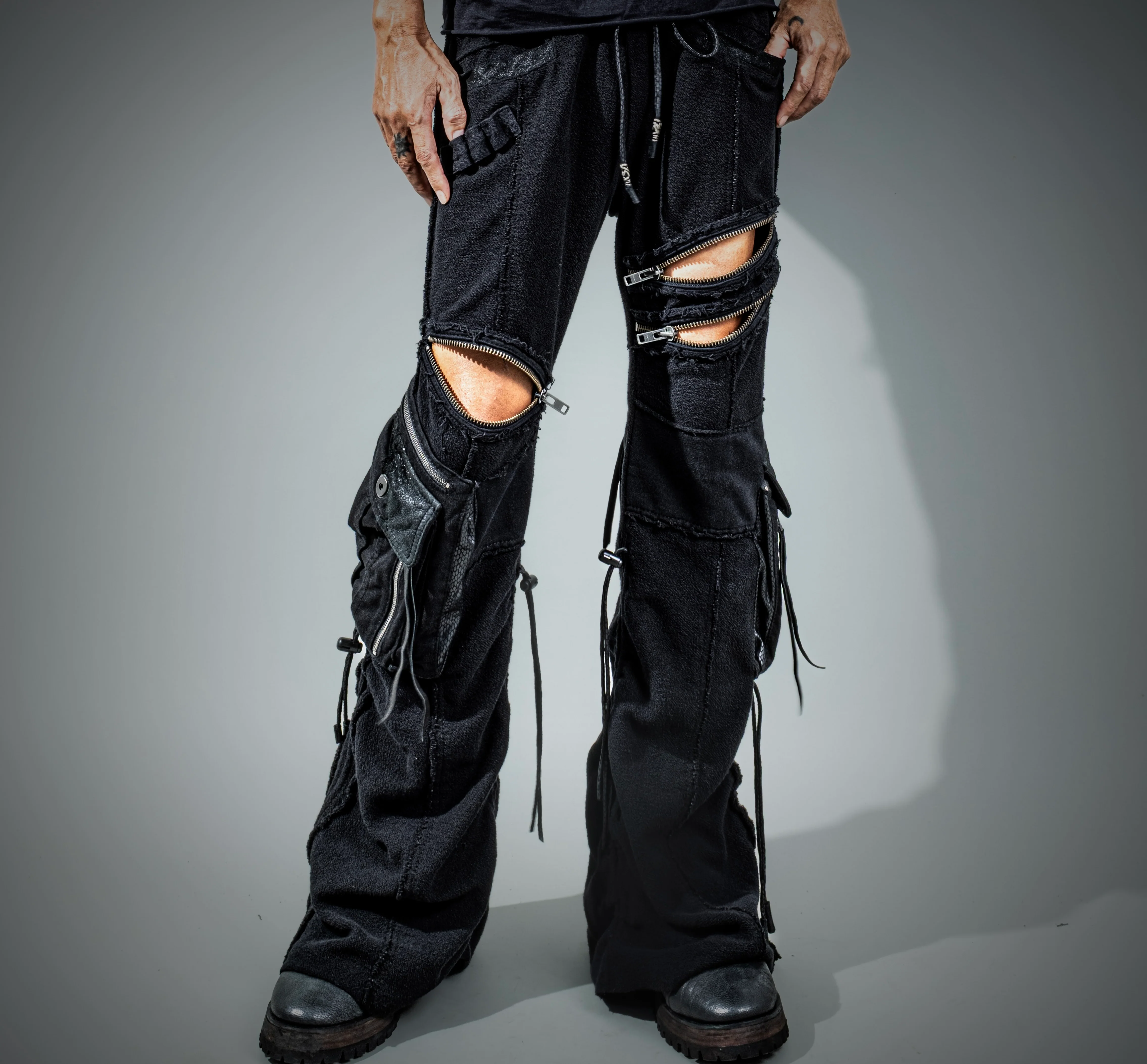 Crafted from soft, resilient sweat fabric, its asymmetric form carries just two pockets—clean, sharp, and ready for action. Adjustable pullstrings at the cuffs invite you to shape the flare and length, letting you command your movement and presence.