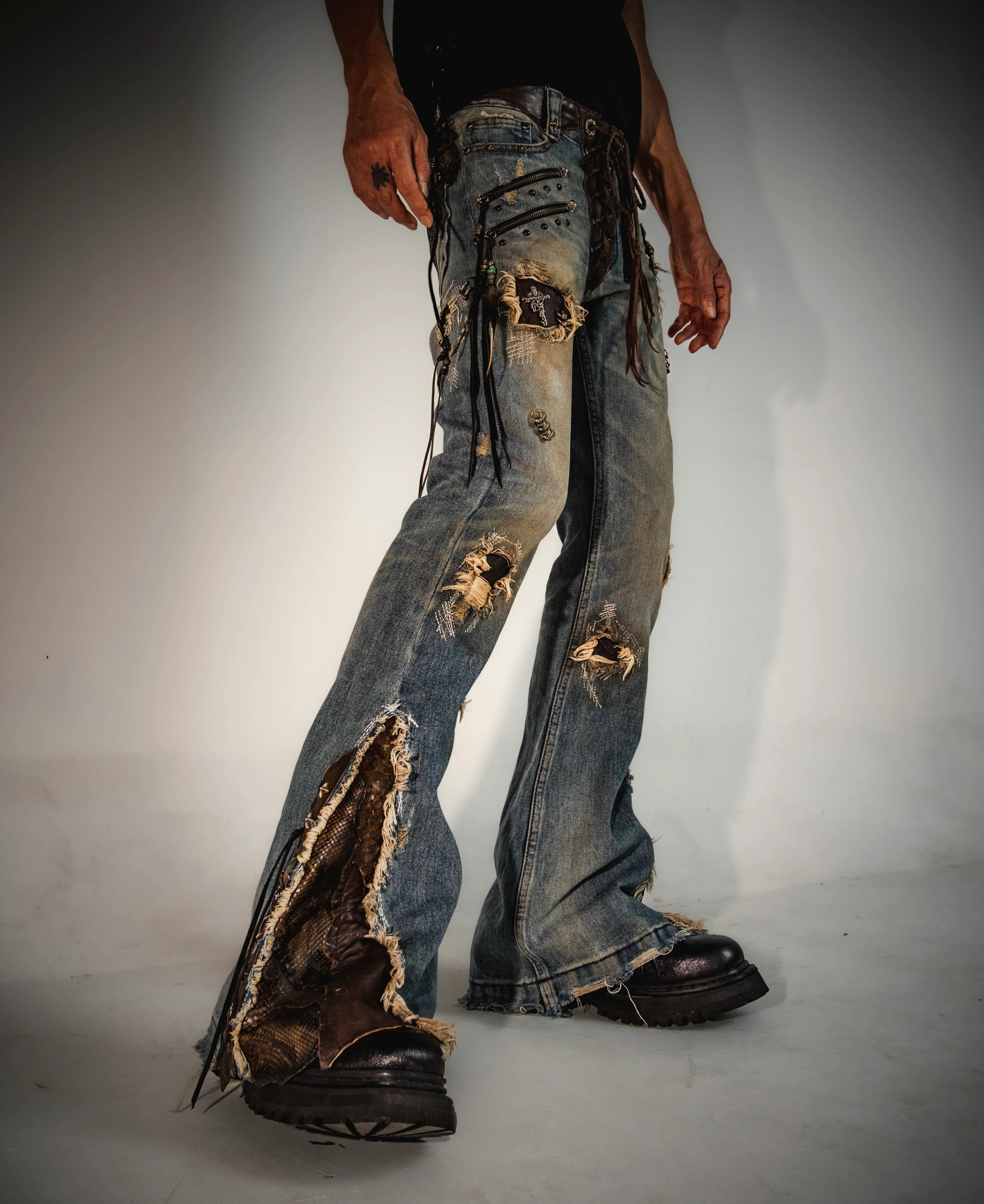 Crafted through the same reconstruction approach, the piece combines selvedge denim, goat leather, snakeskin, and carefully positioned stones—creating contrast in texture, tone, and shine, while retaining balance and intentionality.